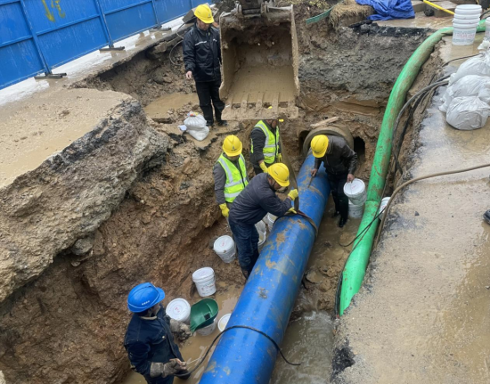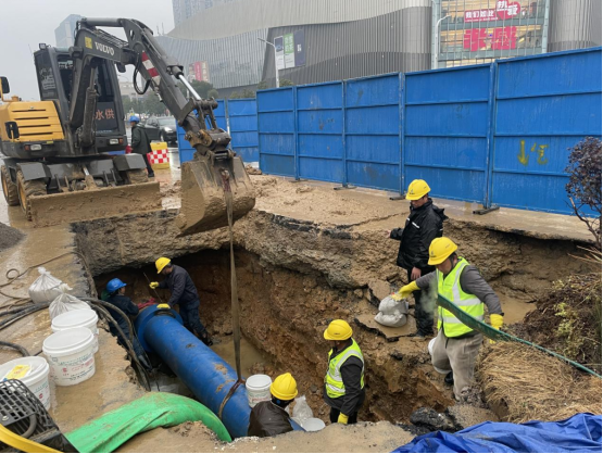 險(xiǎn)情就是命令,凌晨1點(diǎn),公司立即組織10余名搶修人員到場(chǎng)關(guān)閘止水。與此同時(shí),技術(shù)人員、施工人員和設(shè)備設(shè)施“跑步前進(jìn)”、同步到場(chǎng),對(duì)破損溢水點(diǎn)進(jìn)行邊開(kāi)挖、邊診斷。為加快搶修速度,減少對(duì)周邊用戶(hù)的影響,30余名搶修人員頂著嚴(yán)寒天氣連夜搶修。