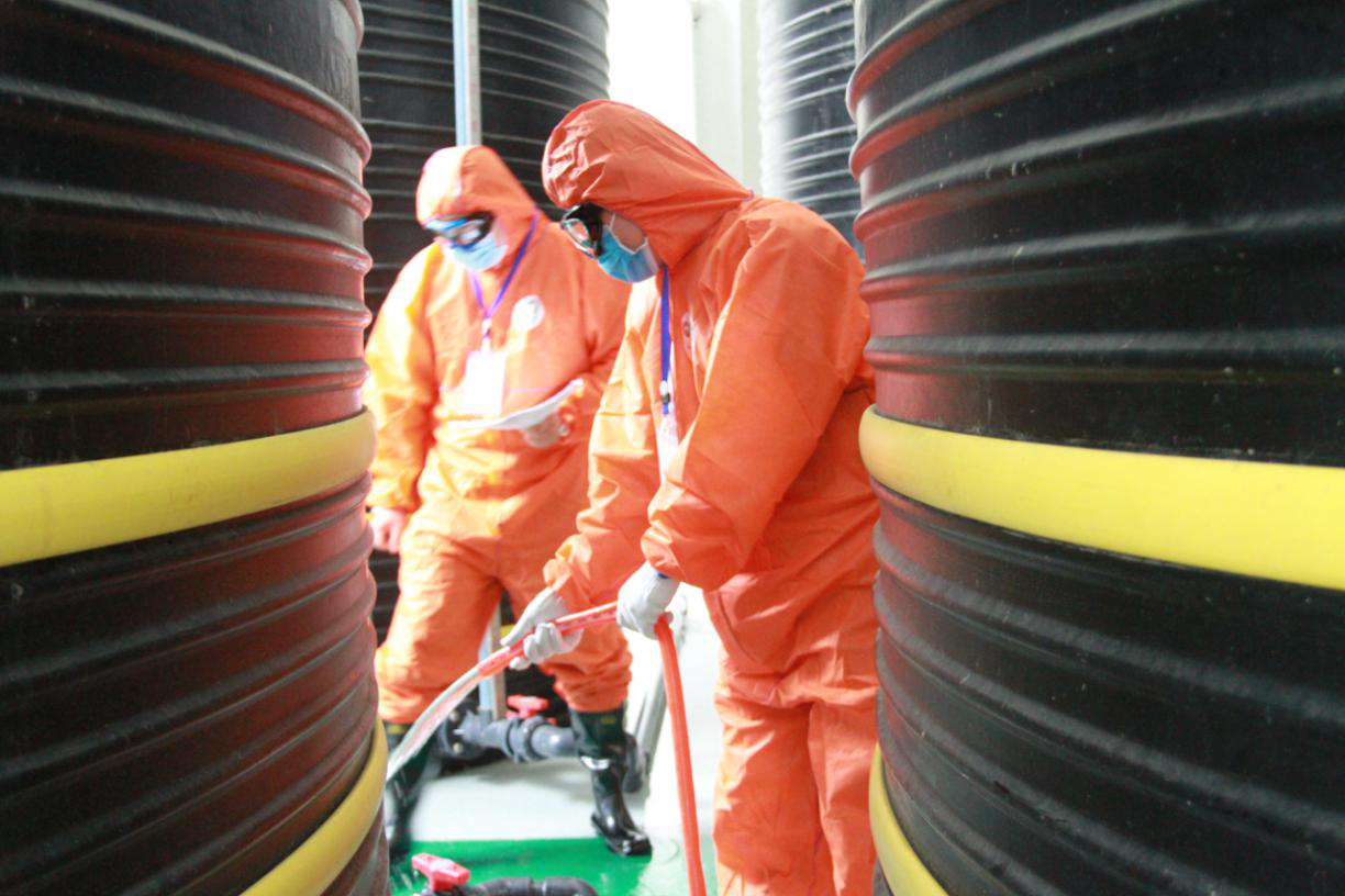 到達(dá)事故發(fā)生現(xiàn)場(chǎng),醫(yī)療救護(hù)組迅速將受傷人員轉(zhuǎn)移至安全區(qū)域,按救護(hù)要求進(jìn)行現(xiàn)場(chǎng)應(yīng)急救護(hù),并同時(shí)撥打120急救電話,將傷者送醫(yī)院救治。隨后現(xiàn)場(chǎng)處置組搶修人員穿戴防護(hù)服進(jìn)入事故現(xiàn)場(chǎng),關(guān)閉相連儲(chǔ)液罐的聯(lián)通閥門并找到漏點(diǎn),用專業(yè)工具進(jìn)行堵漏,在漏點(diǎn)周圍圍堰攔截泄漏的次氯酸鈉,并進(jìn)行稀釋、中和,然后收集處理最后將罐體中的剩余次氯酸鈉溶液轉(zhuǎn)至備用罐中。在確認(rèn)事故現(xiàn)場(chǎng)漏點(diǎn)無泄漏后匯報(bào)給現(xiàn)場(chǎng)總指揮。演練結(jié)束后,現(xiàn)場(chǎng)指揮進(jìn)行了總結(jié),認(rèn)真分析了演練過程中暴露出的一些問題,為處置預(yù)案的進(jìn)一步完善提供了一手資料。