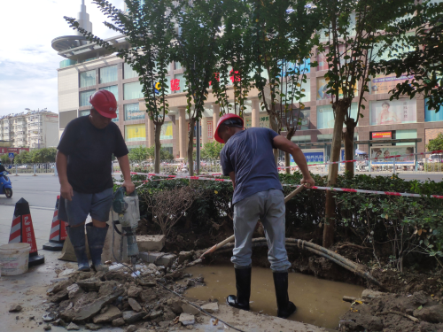 9月9日,我們跟隨搶修車輛來到了今天的第一站:乾坤商務酒店門口,由于管道漏水,現(xiàn)場不斷有水從地底滲出,加上地點特殊我們搶修工只能用鐵鍬等工具將道路破開,再找出破損位置,對管道進行更換維護處理。